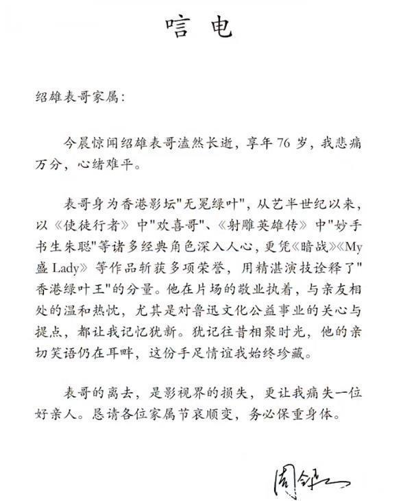 在众多悼念中,人们发现他的表弟周令飞也发出了吊唁。 “今晨惊闻绍雄表哥溘然长逝,享年76岁,我悲痛万分,心绪难平。” “他的亲切笑语仍在耳畔,这份手足情谊我始终珍藏。”