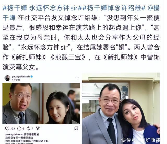 许绍雄的离世,震惊了大半个香港娱乐圈,不少媒体和明星发文悼念、送别。 和他合作过的杨千嬅发文称“永远怀念方钟sir”,很感恩在演绎路上的起点遇见你。