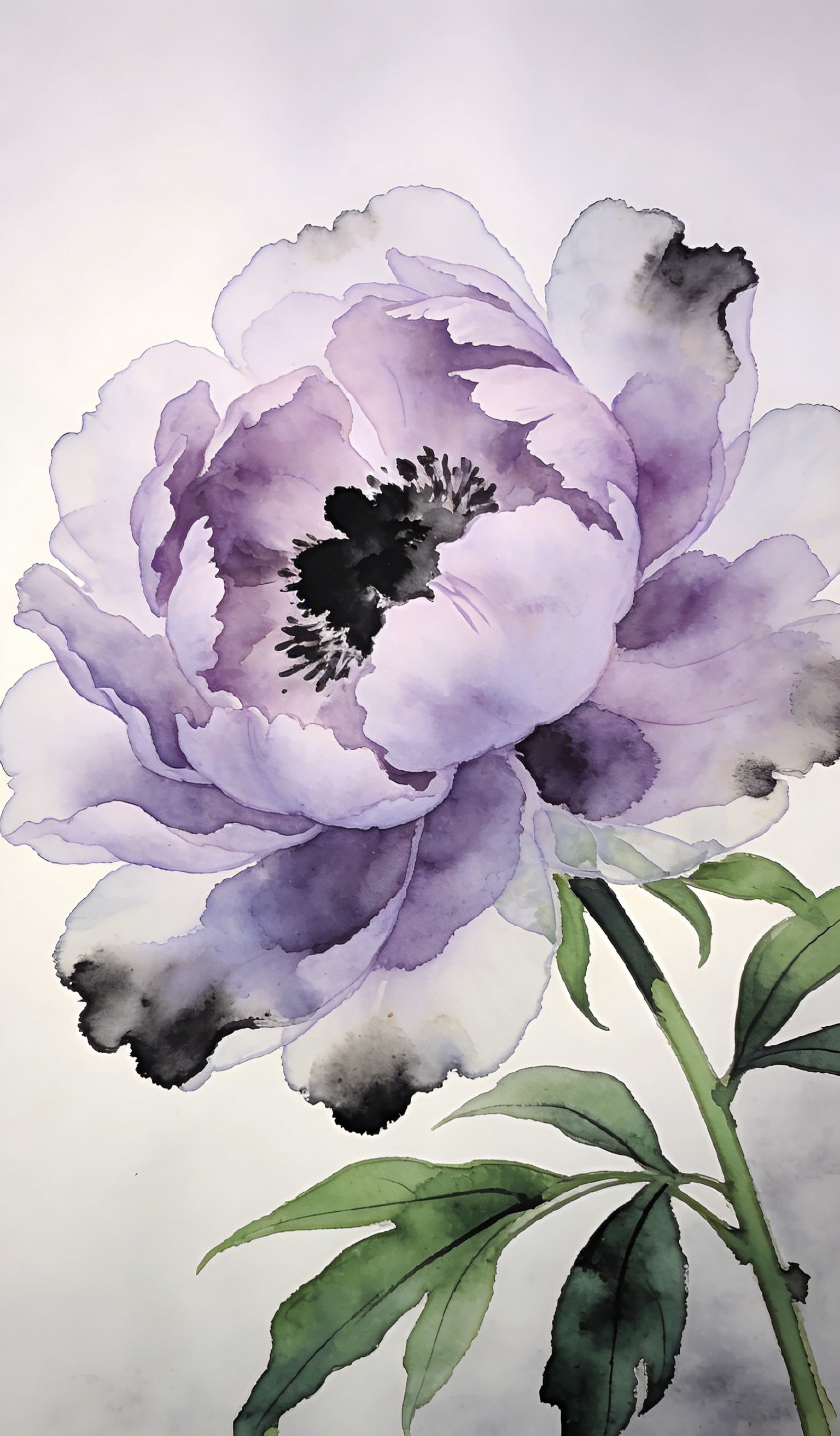 你看它的花瓣,一层叠着一层,像被水浸过的丝绸,又像被月光吻过的薄纱。紫色从花心往外晕开,深紫、淡紫、粉紫,最后晕成近乎透明的白,像少女脸上晕开的腮红,又像傍晚天边最后那抹温柔的晚霞。花瓣边缘故意晕开的墨色,不是败笔,倒像是美人眼角的泪痣,添了几分破碎的、惊心动魄的美。